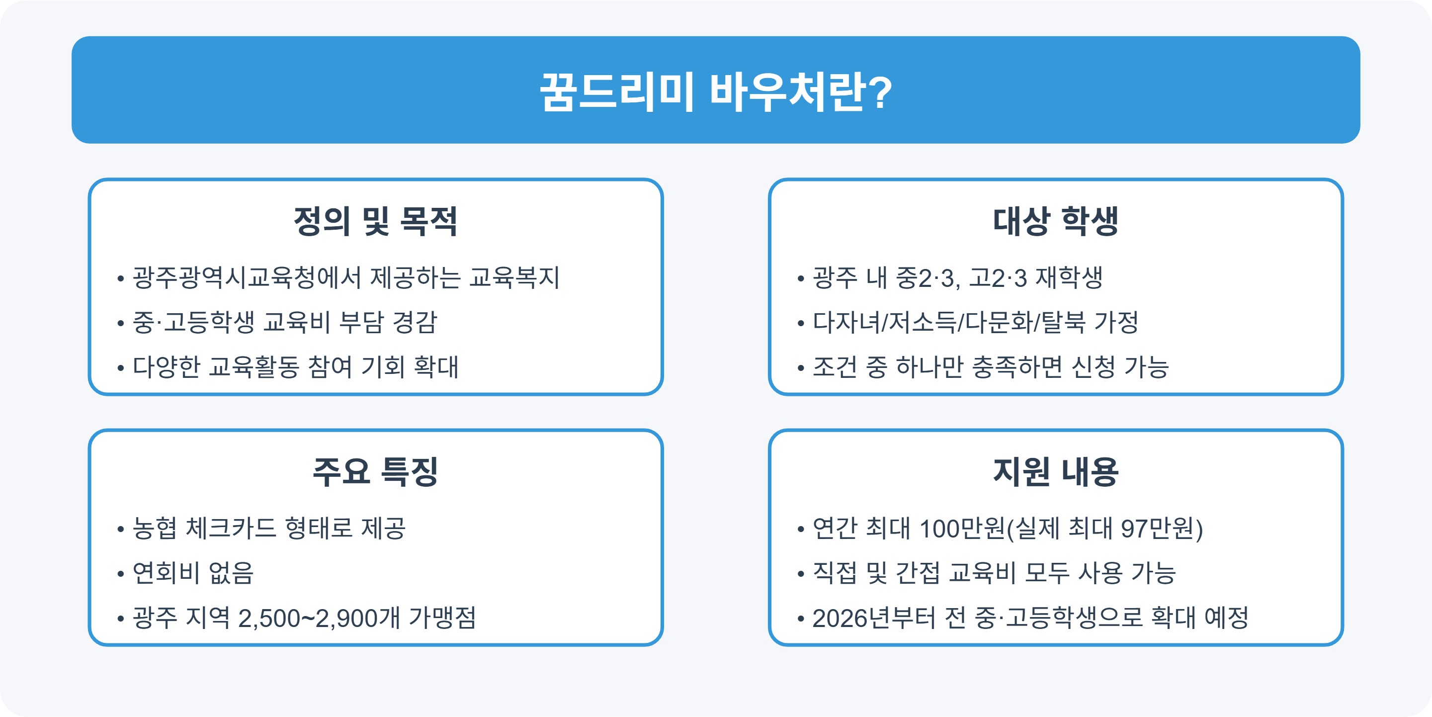 광주광역시 교육청의 '꿈드리미 바우처'는 중·고등학생과 학부모의 교육비 부담을 줄여주는 대표적인 교육복지 사업입니다.