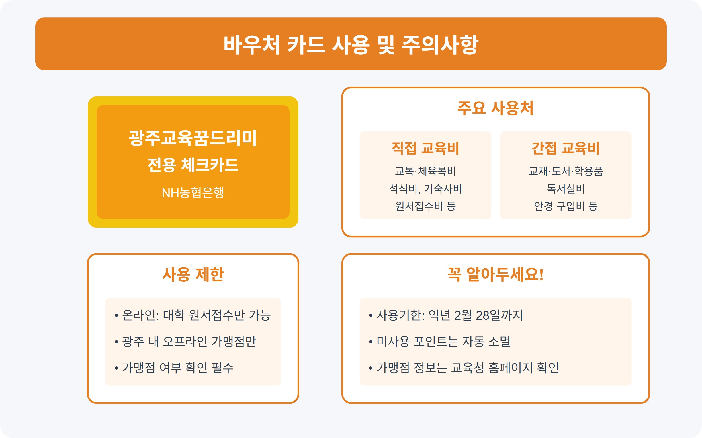 | 사용처 | 광주 내 2,500~2,900개 가맹점, 일부 온라인(원서접수) |